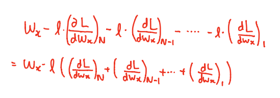 그러므로 각 RNN의 Wx에 대한 미분을 모두 더하고 경사하강법식으로 하면 되는 것입니다.