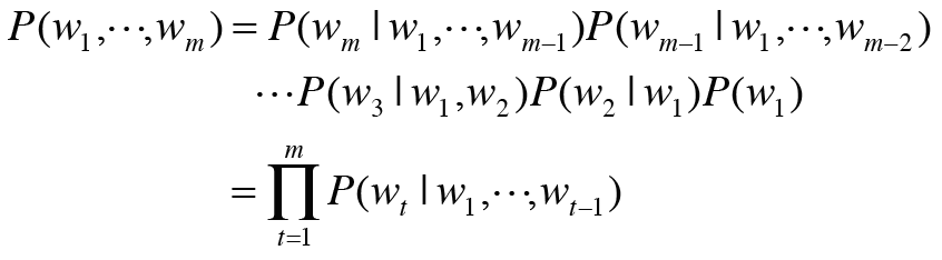( w1~wm-1 다음에 wm이 올 확률 * w1~wm-2 다음에 wm-1이 올 확률 * ..............)