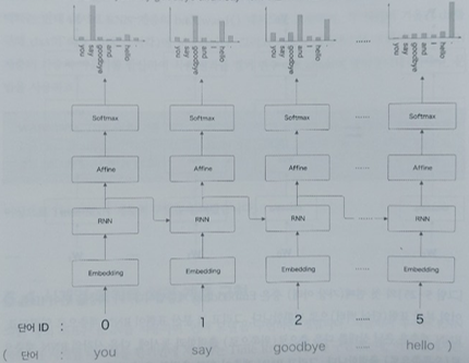 RNN 계층은 은닉 상태를 다음 층(위쪽)으로는 Affine 계층과 softmax계층으로 출력하며,