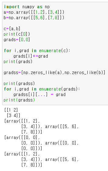 grads 변수에 각 매개변수에 대응하는 형태로 기울기를 초기화한 후 저장합니다.