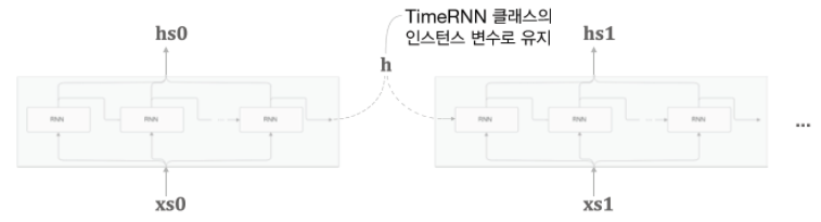 Time RNN 사용자는 RNN 계층 사이에서 은닉 상태를 '인계하는 작업'을 생각하지 않아도 됩니다.