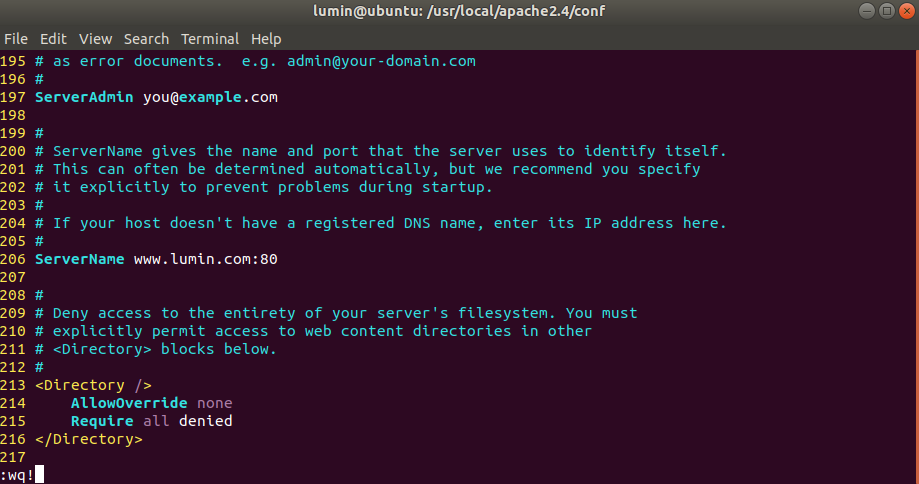 206번째 줄에 ServerName을 설정하고 저장하고 나오면 됩니다.