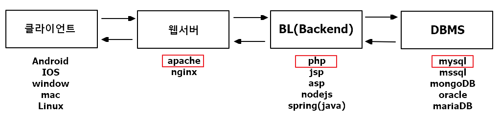 위의 요소들 중 대표적으로 apache / php / mysql을 같이 묶어서 종종 사용됩니다.