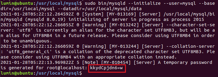 $ sudo bin/mysqld --initialize --user=mysql \