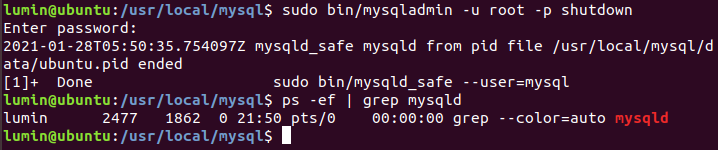 $ sudo bin/mysqladmin -u root -p shutdown