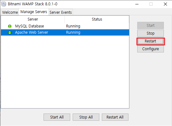 bitnami에서는 다음과 같이 apache server를 선택한 상태에서 'restart'버튼을 누르면 됩니다.