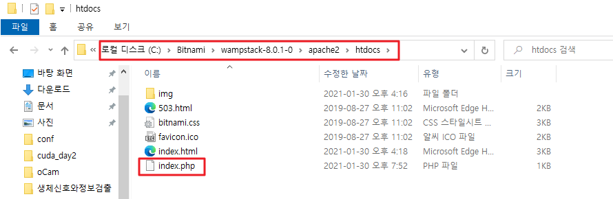 이번에는 php가 잘 작동되는지 확인하기 위해서 php 파일을 htdocs에 만들어 보겠습니다.