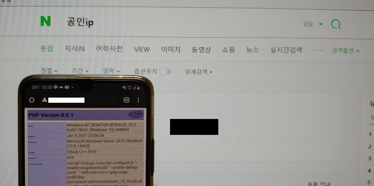 간단하게 네이버에 '공인 ip'라고 검색하면 현재 자신 컴퓨터의 공인 ip주소가 나옵니다.