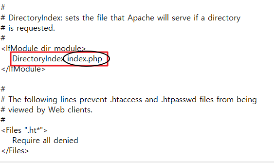 위와 같이 DirectoryIndex 부분이 index.html으로 되어 있을 텐데 이를 index.php로 바꿔줍니다.