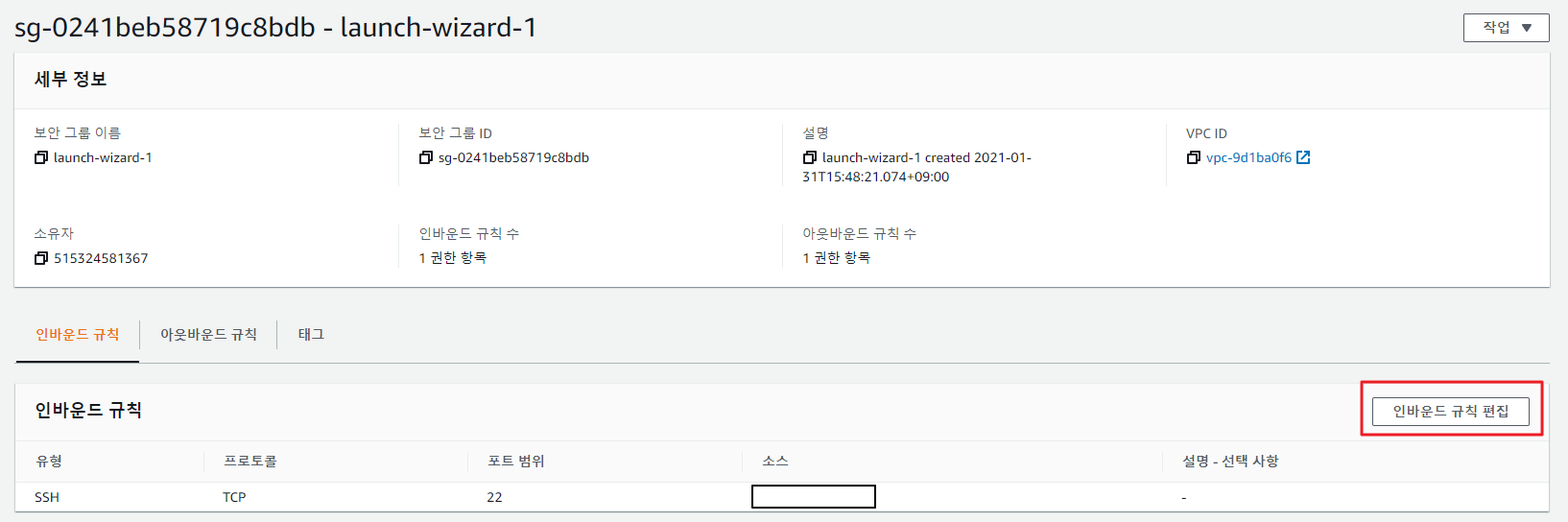 여기서 소스 부분은 보안을 위해서 내 ip(나의 공인 ip)로 설정합니다.