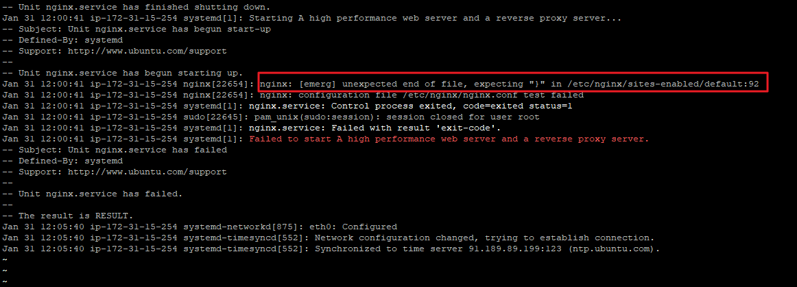 입력하면 다음과 같이 /etc/nginx/sites-available/default 의 92번째에 '}'가 없어서 오류가 났다고 합니다.