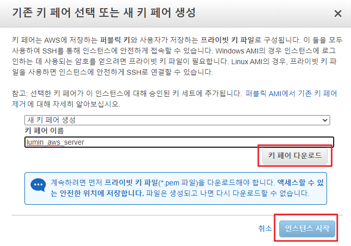 ec2를 생성하고 자신만 접근할 수 있게 하기 위해서 키 페어를 생성해줍니다.