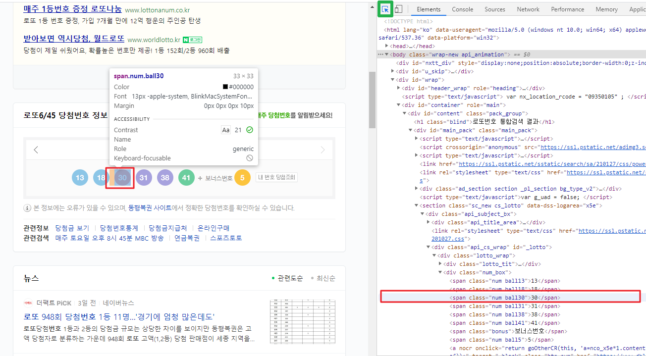 네이버에 '로또번호'라고 검색해보고 개발자 도구를 실행시켜보겠습니다.