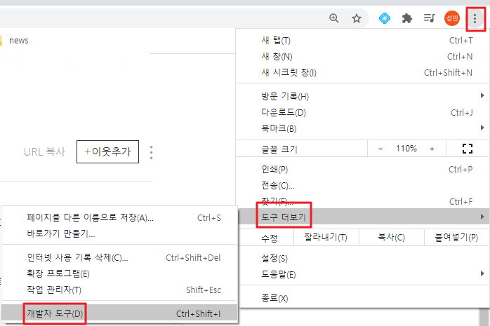 개발자 도구는 다음과 같이 실행시킬 수 있습니다.