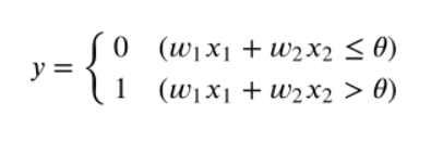 X1, X2는 입력신호, Y는 출력신호, W1,W2(Weight) 가중치, 세타는 임계값,