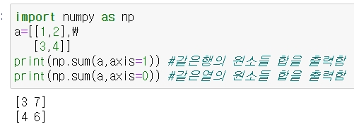형식: np.sum(배열변수) ex) a=[1,2,3,4]인 경우 np.sum(a)의 결과는 10