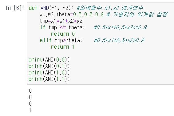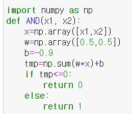 입력이 2개이고 출력이 1개인 퍼셉트론 형태로 AND 게이트를 코딩하면 다음과 같습니다.
