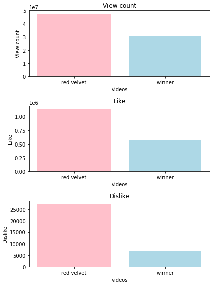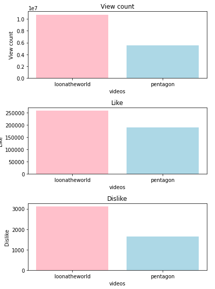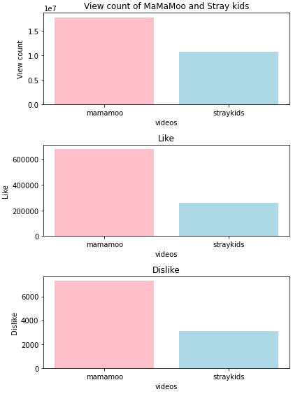 그중 유튜브에서 남자 아이돌과 여자 아이돌의 조회수, 좋아요, 싫어요 데이터에 대해 비교한 결과물을 만들게 되었습니다.