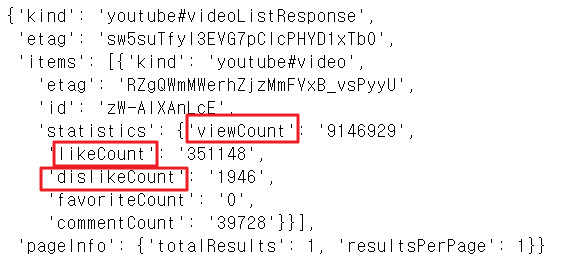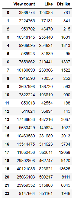 7) 해당 리스트를 이용하여 각 비디오들 마다 조회수, 좋아요, 싫어요 수를 추출하여