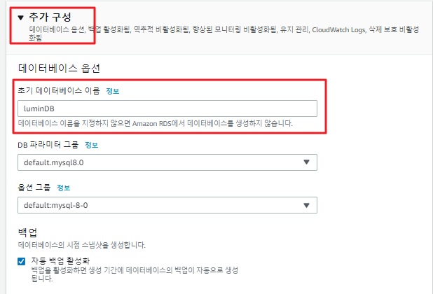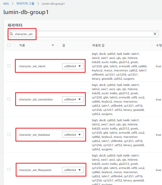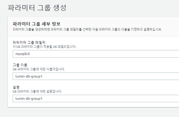 RDS의 파라미터 그룹을 'lumin-db-group1'으로 설정이 필요합니다.