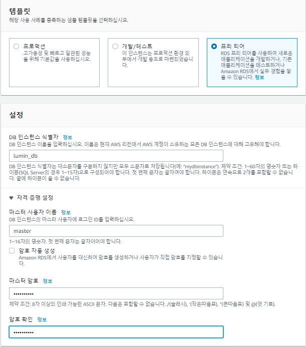 우선 프리 티어로 선택을 합니다. ( 이미 rds가 있다면 두 번째 인스턴스부터는 프리 티어 설정 못함)