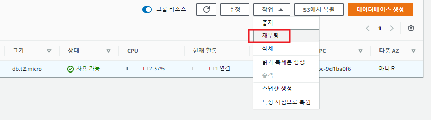 파라미터 그룹의 수정이 생겼으므로 다시 재부팅을 해줍니다.