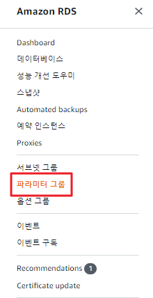 설정하기 위해서 AWS RDS의 [파라미터 그룹]으로 이동합니다.